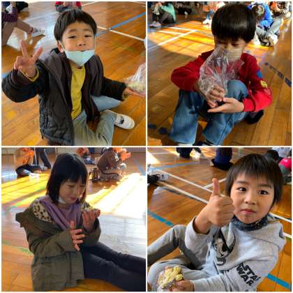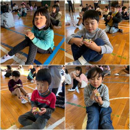 2年生が作ったおにまんじゅうをおいしそうに食べる1年生。少しずつ大切に食べています。おいしいおにまんじゅうに大満足です!おいもパーテーに向けてがんばって準備をしてくれた2年生のみなさんに感謝です!
