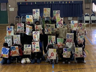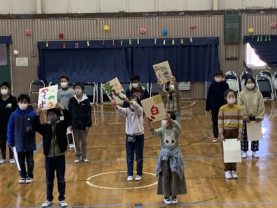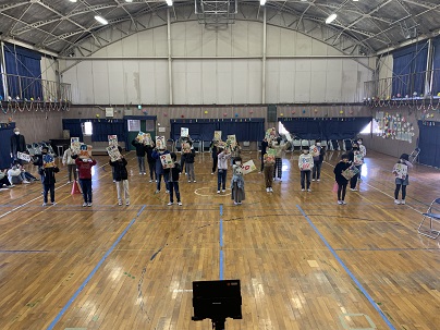 4年生は、WANIMAの「やってみよう」の歌のプレゼントです。歌詞をそれぞれ、手に持っています。中学校でも、いろいろなことをやってみよう!