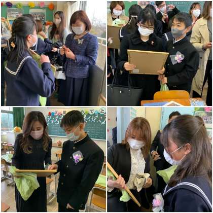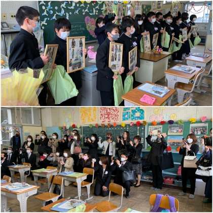 卒業生から、お家の方へのフォトフレームのプレゼント。1年生から6年生までの成長の様子がわかります。