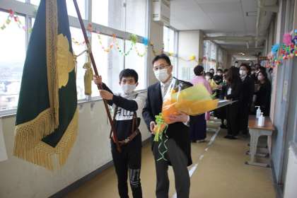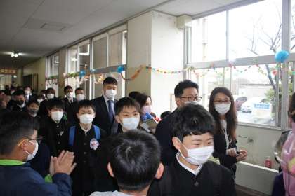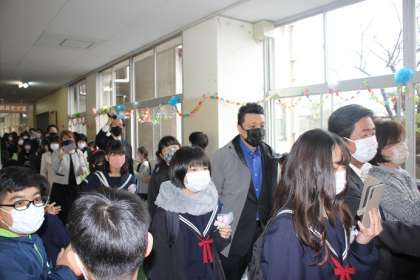 雨のため、校内での見送りとなりました。先頭は、前期の児童会長が行います。