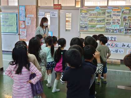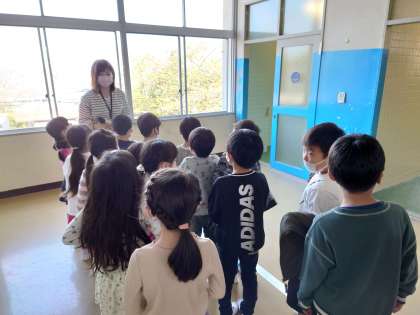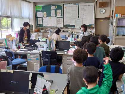 また,職員室に初めて入りました。たくさんの机やパソコンに1年生のみんな驚いていました。