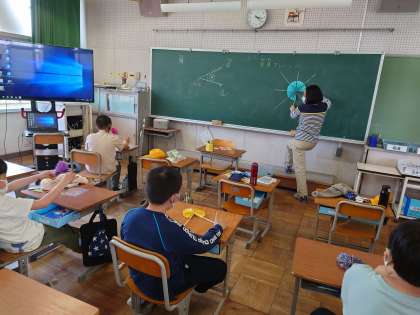 丸く開くおうぎを作り、どんな大きさの角ができるか、先生と一緒に調べています。