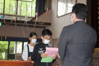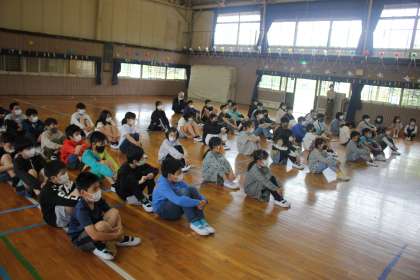 昨年度までお世話になった先生方をお迎えし,5時間目に離任式を行いました。それぞれの先生方にお手紙と花束の贈呈の後,お一人ずつお別れのお話をしていただきました。5,6年生のみ体育館に入場し,2〜4年生はリモートで教室から先生方のお話を聞きました。みんな真剣に話を聞いていました。