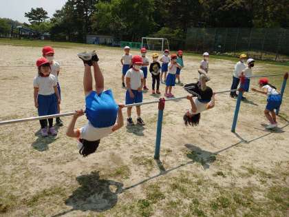 体育の時間に鉄棒あそびをしました。鉄棒がとても上手な2年生。前回り、ぶたの丸焼きポーズ、コウモリポーズ、ぶら下がりポーズ、逆上がりなどに挑戦しました。先生が指示した種目に楽しそうに取り組むことができました。