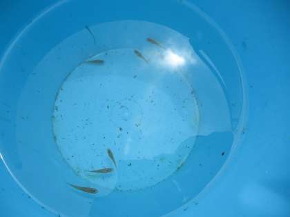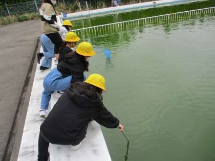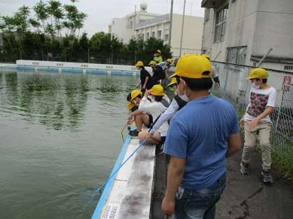 理科で「メダカの誕生」の学習をします。今日は、教室で飼うメダカをプールに捕まえにいきました。メダカの姿が見にくかったようですが、タモですくって捕まえることができました。教室で大切に育てていきましょう。