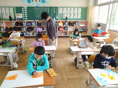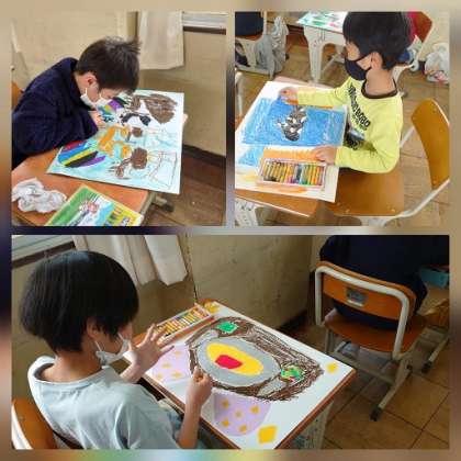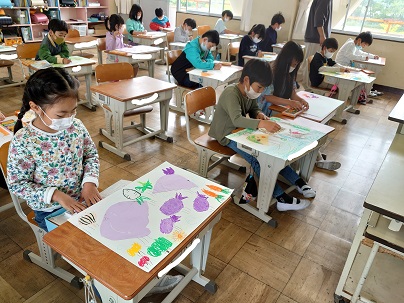図工の「ふしぎなたまご」の作品を仕上げました。子どもたちは卵から思い思いのものを誕生させた絵を描きました。シャチ、ハンバーグ、パンダなどなど…。発送力豊かな絵ができあがりました。