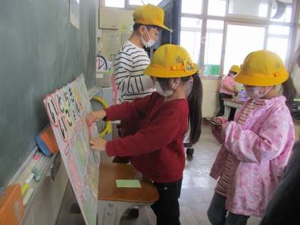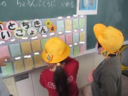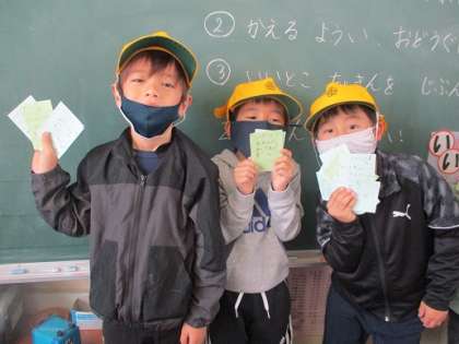 1年生も「いいとこちょきん」で友達のよいところをカードに書き合って、自分のポケットに入れました。「いつもべんきょうをがんばっているね。」「いつもそうじをがんばっているね。」「いつもあそんでくれてありがとう。」友達のよいところをたくさん見つけることができます。毎日、帰りの会でも、友達のよいところの発表でたくさん手が挙がります。これからも友達を大切にしていきましょう。