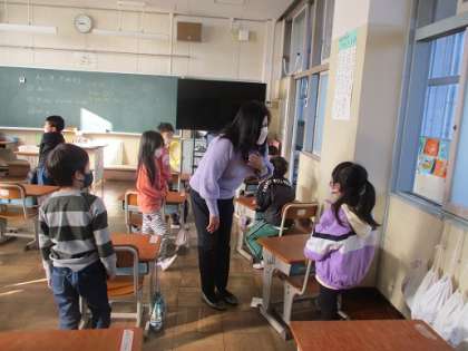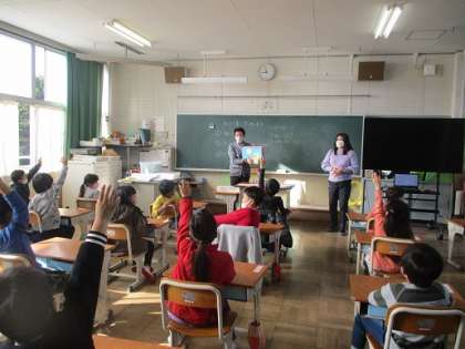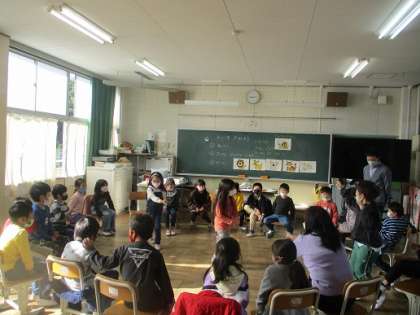 英語活動の時間に、ALTのマリビック先生と一緒に学習しました。はじめに、先生たちと一人ずつ英語で上手にあいさつすることができました。動物の言い方をクイズ形式で学んだあとに、みんなでアニマルバスケットをしました。一時間、英語を楽しく学ぶことができました。