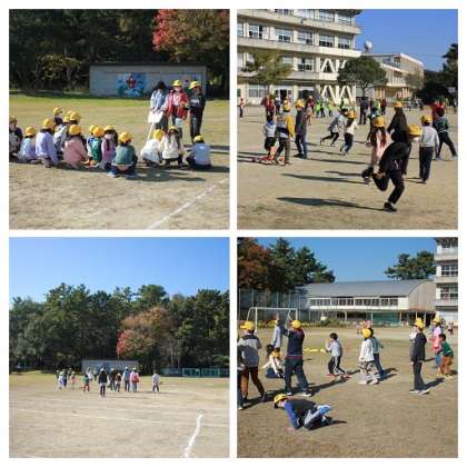 校庭には紅葉した木があり、秋の晴れた空の下、子どもたちの楽しさと秋の美しさがミックスされて、いい日になりました。前の日まで準備をした6年生は、1年生から5年生の笑顔が自分たちの喜びになりました。