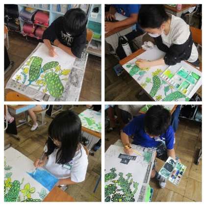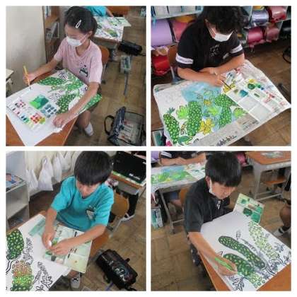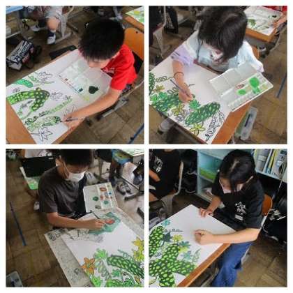 ゴーヤの絵とともに自分のお気に入りの風景を描いています。墨汁と絵の具で描かれたゴーヤの絵は、とても存在感があります。自分の絵としっかり向き合って、集中して取り組んでいました。静かな時間が流れていました。