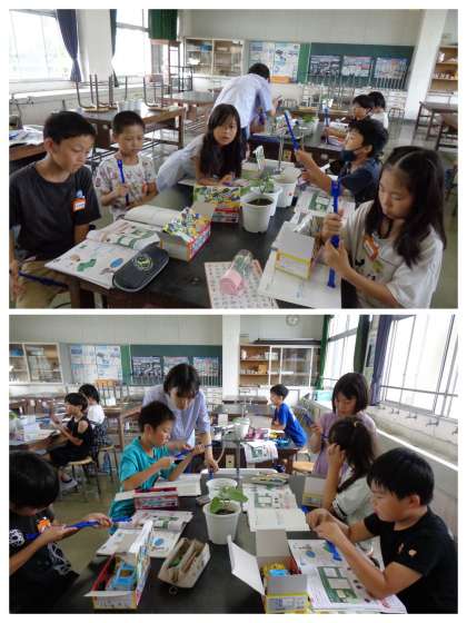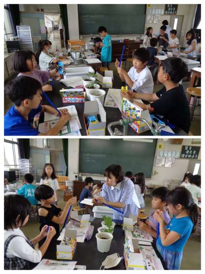 今日の理科では,ゴムのはたらきを調べる実験を行いました。はじめに,普段の生活でゴムを使う場面や経験から「ゴムは伸ばすと縮む」ことに着目し,予想を立てました。