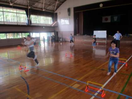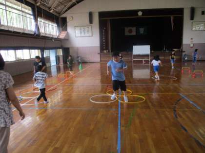 1時間目に、すずらんでかけっこをしました。今回は障害物競走のように、ミニハードルを跳び越えたりフラフープをケンケンで進んだりしました。子ども達はとても楽しそうに、そして上手に走ることができました。