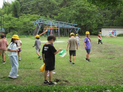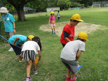 生活科の時間に、校庭で生き物さがしをしました。モンシロチョウやトンボ、ショウリョウバッタやトノサマバッタ、クモやトカゲなどの生き物を見つけることができました。セミの声も聞こえはじめ、木にその姿を見つけた子もいたようです。