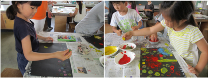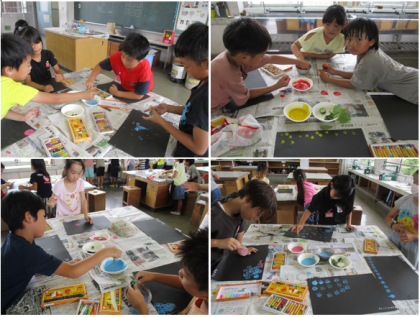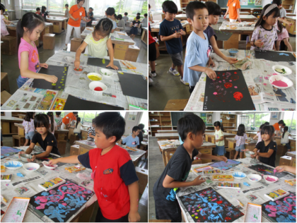 図工の時間に、おやさいスタンプをしました。野菜の実の部分だけでなく、葉の部分も使いました。お片付けもみんなで協力し、最後まで楽しく取り組むことができました。夏休みに、自分が育てたお野菜で取り組んでみてもよいですね。