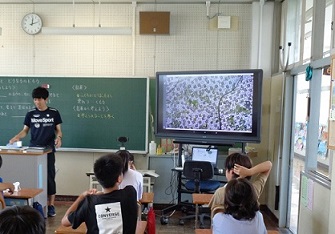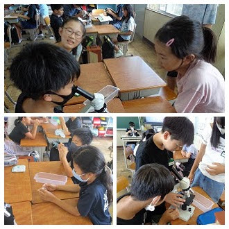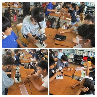 根から葉まで運ばれた水は、どうなるのかを考えました。ホウセンカにポリ袋をかぶせて、しばらくすると、ポリ袋に水滴がつきます。そのことから葉のどこかから水蒸気が出ていることがわかりました。そして、水蒸気がどこから出てくるのかを調べるためにツユクサの葉を観察しました。顕微鏡で見るとたくさんのくちびるのような穴が見られました。実験や観察を通して、植物の体の中の水の流れが分かってきましたね。