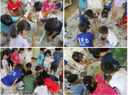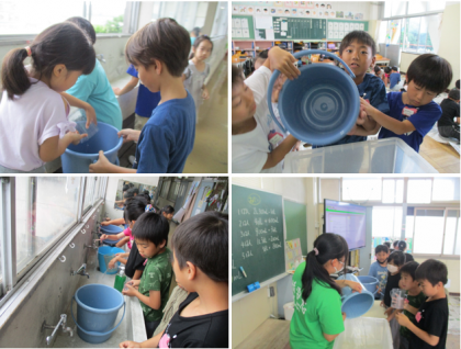 「かさ」の学習を使ってみんなで水を桶に溜め、「ペットボトルの蓋つかみ大会」をしました。班ごとに「1L5dL」「3L−2L」「6dL+6dL」などお題が異なる中、班の友だちと相談しながら、LますやdLますを使って水を溜めることができました。みんなで水を溜めた桶にペットボトルの蓋を浮かべ、30秒でどれだけ割り箸で掴むことができるかチャレンジしました。一番多い班は、46個も掴むことができました。