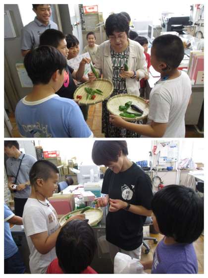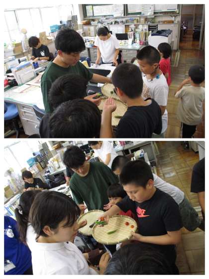 大放課に、すずらんで育てた夏野菜を職員室へ販売しに行きました。販売したのはオクラ、ナス、キュウリ、ピーマン、ミニトマトの5種類です。先生方にたくさん買ってもらって、見事に完売しました!あいさつや野菜の宣伝、お会計などもしっかりとできました。