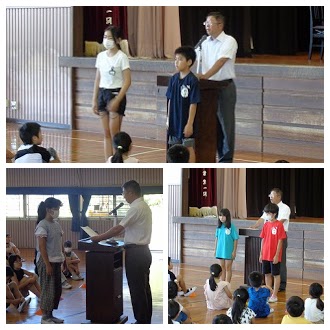 終業式がありました。校長先生より1学期のことを振り返り、特に小鈴谷小学校のためによくがんばってくれた5名の児童に「なみなみ大賞」が贈られました。通学団で来るときに、低学年の子を根気よく支えてくれた子、運動場に残っていたボールなどを片付けてくれた子、みんなのためにがんばってくれたことを表彰してもらいました。