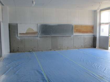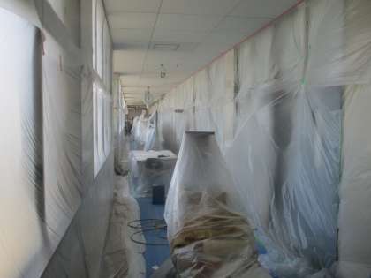 大規模改修 その1 公開日 2023/07/25 更新日 2023/07/25 校長室 夏休み早々、一気に始まりました。連日50名以上もの作業員が校舎全てを一斉に改修しています。この写真は3階の廊下と教室です。児童用ロッカーや黒板、床や天井、サッシまで全てリニューアルします。