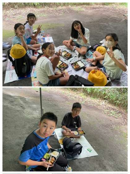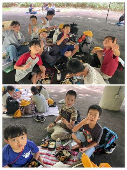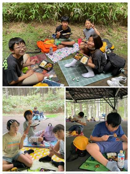 お昼ご飯にからあげ弁当を食べました。天気が心配されたので、昨日使ったファイヤー場です。