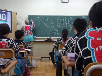 4年生は、社会科の学習の一環で地域の祭りの学習をしています。今日は、盛田さんを学校にお招きし、お祭りについてのお話をしていただきました。お祭りのはっぴを着させてもらい、大谷地区の祭りや、命のバトンについて深く学ぶことができました。