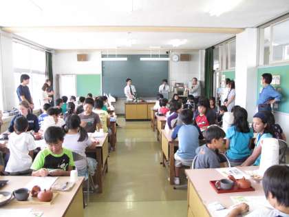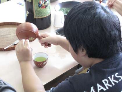 ボランティアの方に分かりやすく教えてもらいながらお茶を入れました。1煎目と2煎目、3煎目と全く味が違うことやお茶の葉で、入れたときの香りや色が違うことが分かり、一生懸命にメモをとっている姿が見られました。また、お茶菓子と一緒においしそうにお茶をいただくことができました。