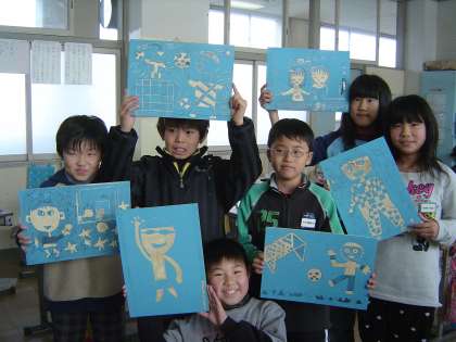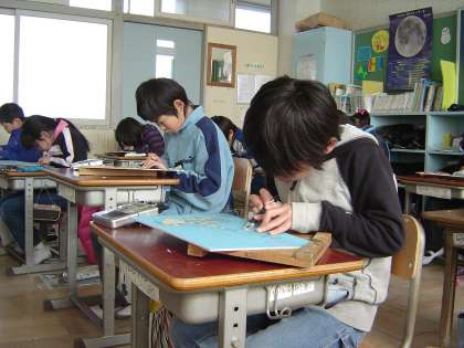 彫刻刀を使った木版画。初めての経験で緊張しながら、がんばって製作しています。恐る恐る動かしていた手つきも彫りが進むにつれてだんだんと良くなり、職人のようです。どう出来上がるか、刷るのが楽しみです。