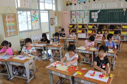 1年生は、貼り絵をしていました。2年生は、昨日出かけた探検について、写真を使ってまとめる最中でした。