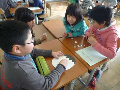 ビッグフェイスゲーム 公開日 2015/01/20 更新日 2015/01/20 4 年 今日は英語を使って福笑いをやりました。 顔のパーツの単語を覚えたり、上や下などの動かす向きの単語を覚えたりした後、指示する役とパーツを置く役に分かれて楽しみました。 今までとは違った方法で日本の伝統的な遊びができたので、子どもたちもとても新鮮な気持ちでやっていました。