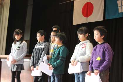 朝会(表彰) 公開日 2015/01/20 更新日 2015/01/20 校長室 1月19日(月)は、3学期最初の朝会でした。少年野球のマラソン大会で活躍した子と尾書研で特選・優等・入選に選ばれた子の表彰が行われました。