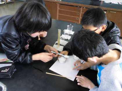 理科で新しい学習に入りました。今日はメスシリンダーの使い方を学習したあと、食塩とミョウバンを水にとかし、比較しました。ミョウバンはあまりとけない、食塩は全部とけた、など実験からわかりました。