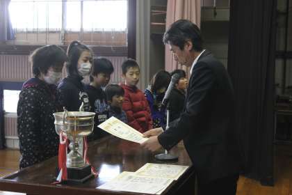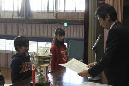 2月9日(月)の朝会では、読書感想文コンクールで優秀な成績を収めた子の表彰と部活で活躍したチームの表彰が行われました。