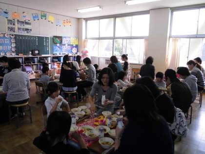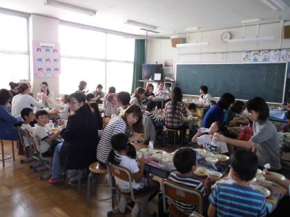 学校公開日にはたくさんのお家の方に来ていただきました。1年生は給食試食会で、お家の方と一緒に給食を食べました。みんなお家の方と給食を食べるのをとても楽しみにしていて、おいしそうに食べていました。お家の方には準備を手伝っていただきました。ありがとうございました。