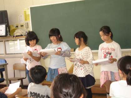 10月22日(木)国語の単元「伝えよう 楽しい学校生活」で、「お家の人に伝えよう」ということで、学校公開日に合わせて、お家の人が知らない学校のことを作文にして発表しました。伝えたいことが同じグループを作りました。9つのグループができました。たくさんのお家の人の前で発表するのは、緊張したようです。