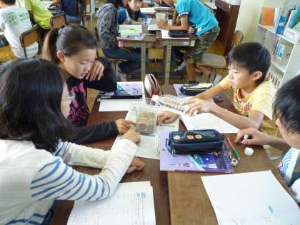 乾電池をビル,発泡スチロールをマンホールと考え,地震が起きるとどうなるか実験してみました。ビルが沈み,マンホールが浮き上がる様子を実際に見ることができ,地震の怖さを実感することができました。