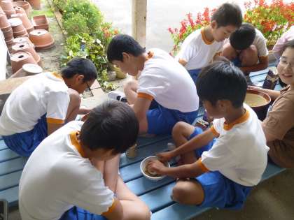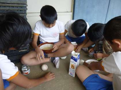 2週間干した米をいよいよ脱穀し,もみすりをしました。脱穀は牛乳パックを使って穂からもみを取り,もみすりは,すりばちにもみを入れ,軟式ボールですりました。もみがらを吹き飛ばすのですが,米粒をいっしょに吹き飛ばさないようにするのがとても大変でした。