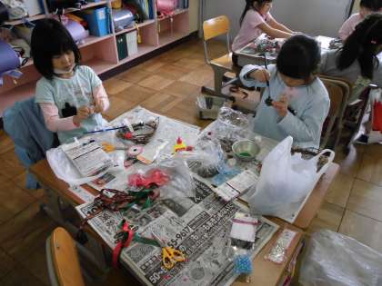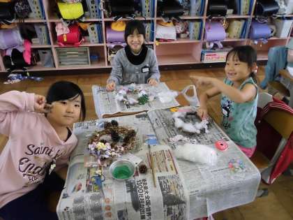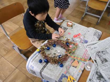 1学期から育ててきたあさがおが枯れ、リースを作りました。家庭から様々な飾りをもってきたり、桧原公園で拾った木の実を飾りに使ったりして、とてもきれいなリースができました。お家の方には、リース作りや飾りの準備など、たくさん協力していただきました。ありがとうございました。