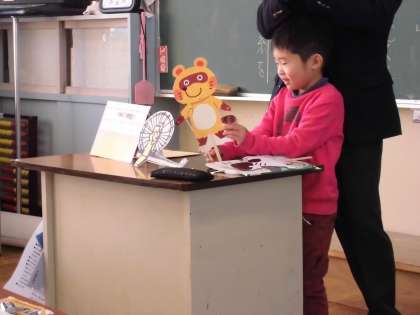 国語でたぬきの糸車を学習しています。たぬきやおかみさんのペープサートを使って登場人物の気持ちにせまります。上手に動かしながら、登場人物の気持ちを考えることができました。