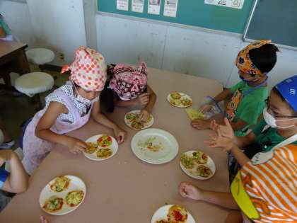 2年生が収穫した野菜で,パリチップス(餃子の皮のピザ)を作りました。一人3枚ずつ作り,1枚は,お世話になっているペア学年の4年生に届けました。自分たちで育てた野菜で作ったパリチップスは,とてもおいしかったです。