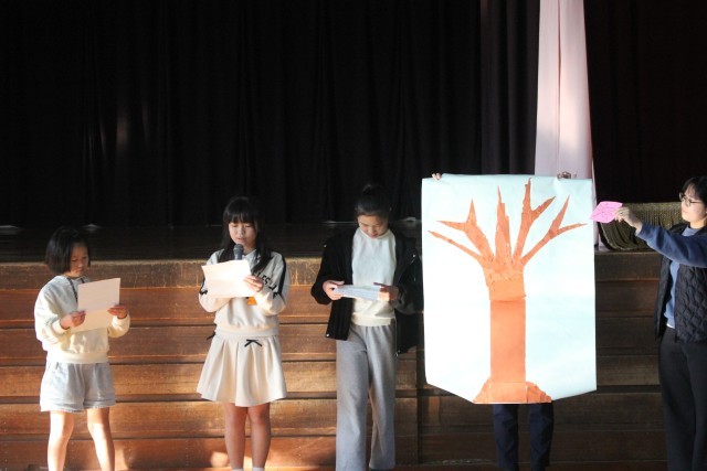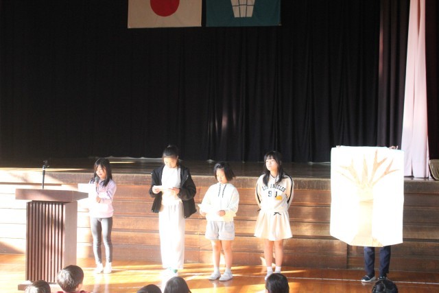 今日の朝会では、図書委員会から読書週間の取組についてのお知らせがありました。