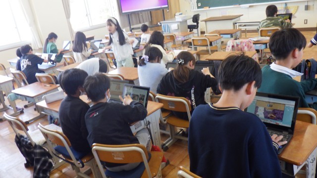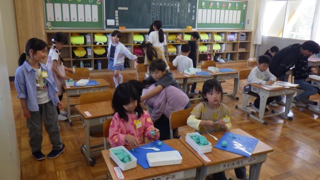 昨日の雨のせいで、今日はグラウンドが使えません。大放課は教室で静かに過ごします。1年生の教室には、いろいろな学年の子が訪ねてきてくれました。粘土をしたり、トランプをしたり、タブレットを使ったりしながら、思い思いに過ごしていました。