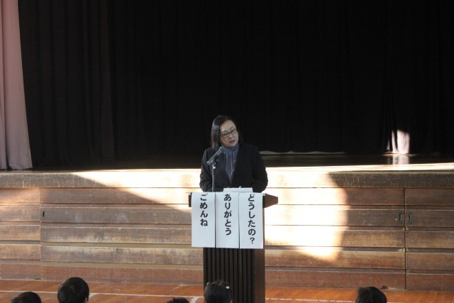 今日の朝会では、人権週間にちなんで人権についての話をしました。人権とは、「誰もが生まれてきた時から持っている幸せに生きるための権利」であり、「自分のこともまわりの人のことも同じように大切にしよう」と話しました。覚えてほしい3つの言葉「ごめんね」「ありがとう」「どうしたの」を「まほうの言葉」として、たくさん使ってくださいとも伝えました。みんな真剣な表情で話を聞いてくれました。すずっ子たちが、毎日笑顔で元気に登校してくれることを願っています。