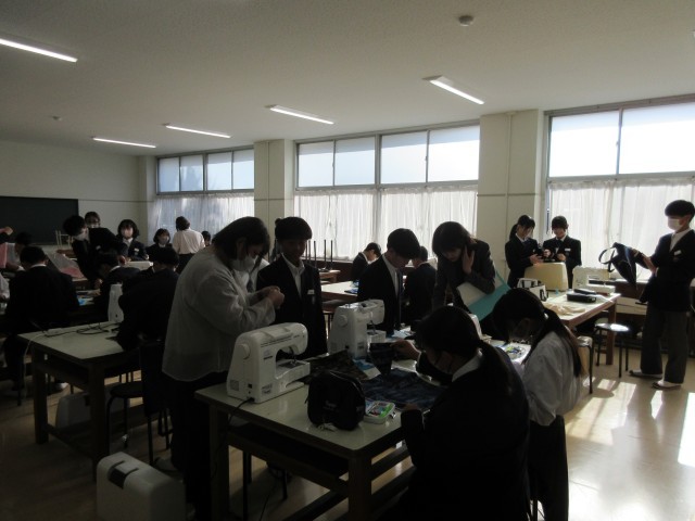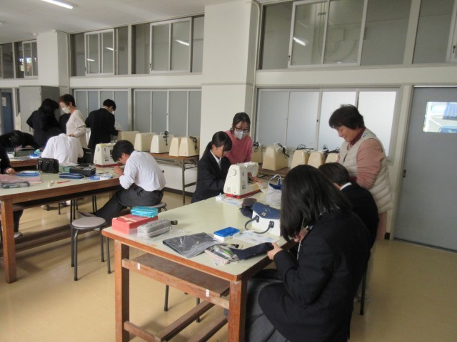1年生では、裁縫の授業を行われています。一人一人が自分のペースで行ってい、分からないことはミシンボランティアの方々に声をかけて聞いていました。ミシンボランティアの方々は、1年生の生徒に丁寧に教えてくださっているので、生徒たちはスムーズに進めることができました。