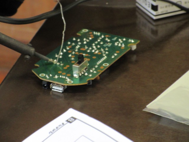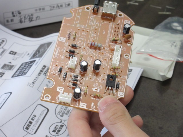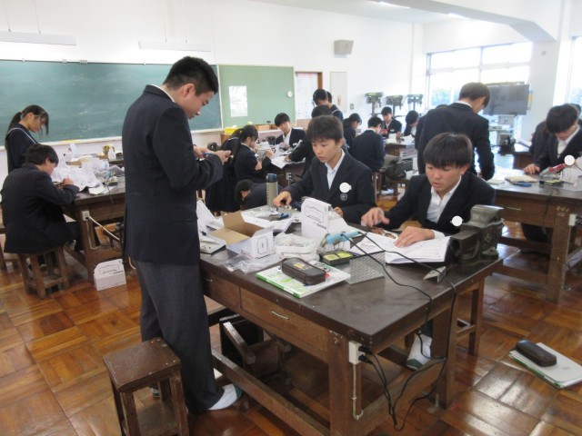 2年生は、はんだごてを使って、基板づくりを行っています。はんだ付けに慣れてきたこともあり、きれいに付けることができています。基板のそれぞれの箇所に、さまざまな役割があります。難しいことを学んでいると思います。