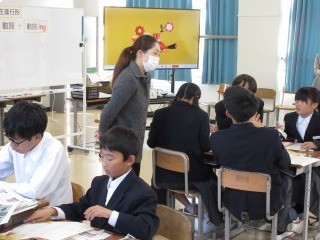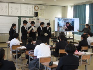 1年生の英語の授業では、現在進行形を用いて、学校の様子をレポートする活動を行いました。班で協力して、紹介文を作り、全体の前で発表しました。その後は、聞き取った英文を、プリントに起こし、ライティングの活動にもつなげていました。身近な人々や出来事を紹介することに、興味をもって取り組みました。