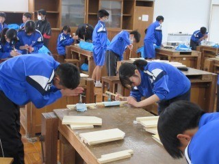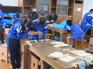 常滑市出身の家具職人を講師に迎え、青海中学校木工室で、お箸作りを体験させていただきました。