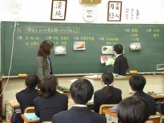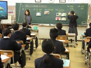 3年生の英語の授業では、教科書の音読練習の時間に、教師に範読に続いて、教科書を手に持ち、立って大きな声で練習していました。よく集中しています。