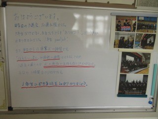2年生の廊下には、職場体験の記録の掲示物や、英語の授業で取り組んだマレーシアの子どもたちとの交流の掲示物が掲示されています。そして、階段あたりには毎朝、学年主任のメッセージが書かれたホワイトボードが書かれています。今日は、今年を象徴する漢字一文字は何ですか?と問いかけるメッセージもありました。子どもたちのことを考えた温かいメッセージが書かれています。
