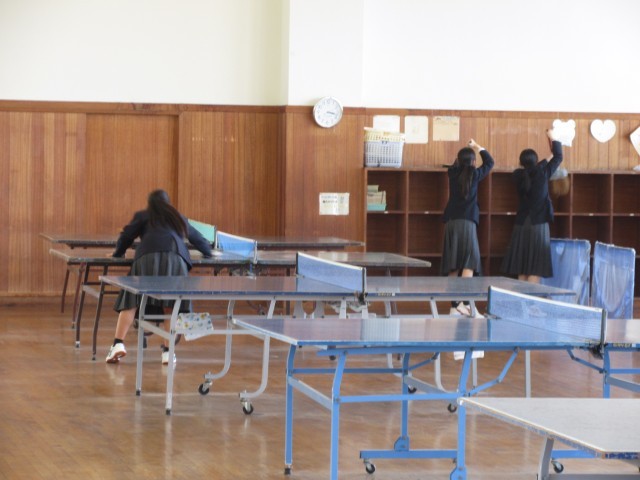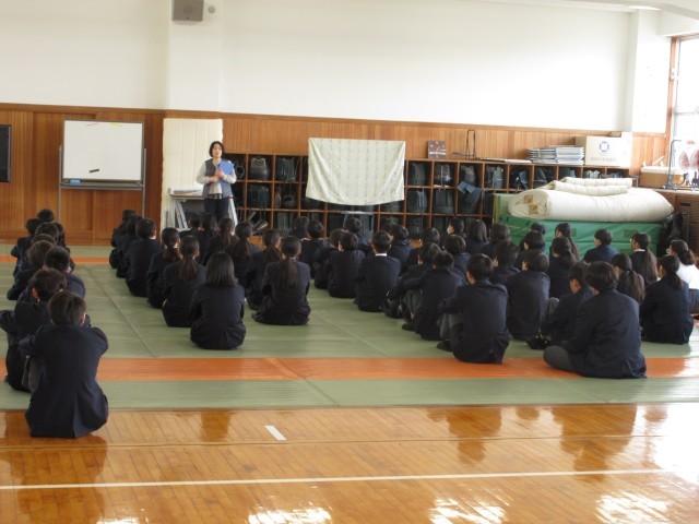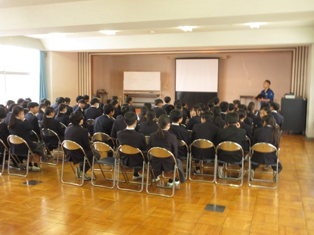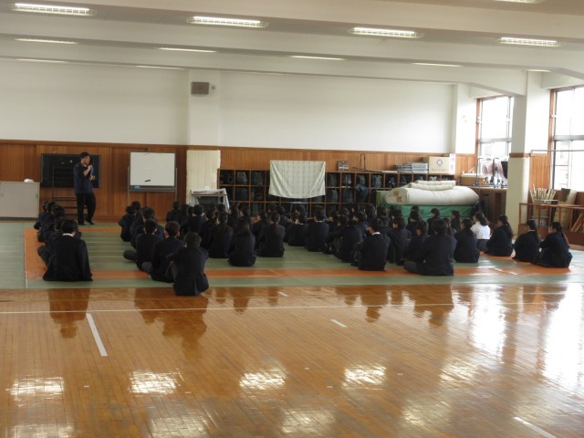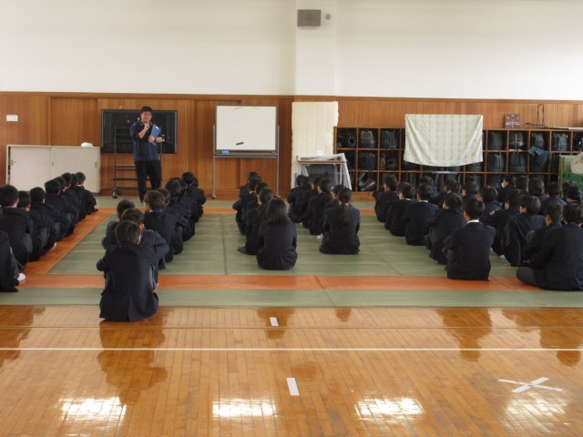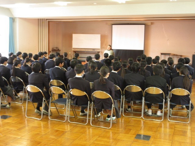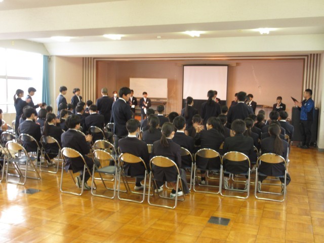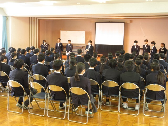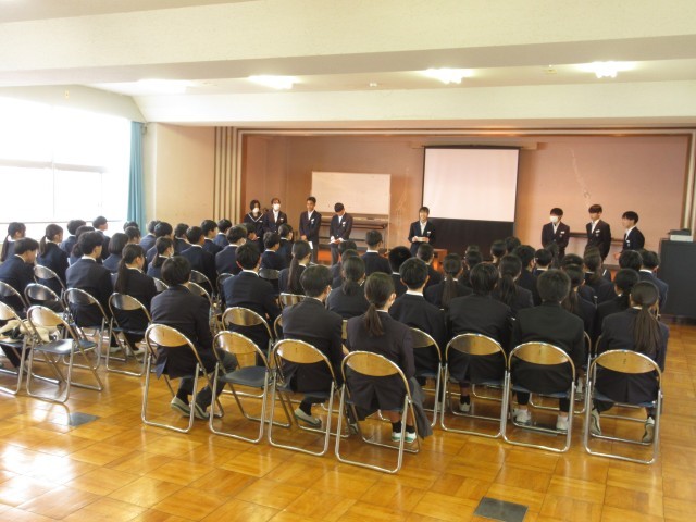 「あいさつは、もっとも簡単にできる思いやりある行動」です。あいさつを通して、人と人とのつながりを大切にしていきましょう。もう一つの話は、「昔、いろいろな班やグループ、ペアを決めるときに、いつもクジで決めるクラスがありました。そのクラスはだれもがお互いに会話できるような、本当にみんなが仲がよい、安心感のある素晴らしいクラスになった」という話でした。好きな子同士、気の合う者同士で、班やグループ等を決めることがよくあるのですが、自分と個性や考え方が異なる人と一緒になることで、いろいろなことを学んだり、人間的な幅を広げられたりすることもあります。社会に出れば、どんな人と一緒に仕事をすることになるかは分かりません。そんな中でも、理解し合ったり、接し方を考えたりして一緒に働いていくことが大切です。学校では、人間関係がいつも固定的になりすぎず、オープンマインドを大切に、そんな広い人間関係構築力を高めてほしいという講話でした。 -