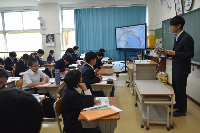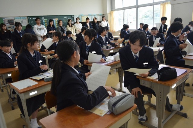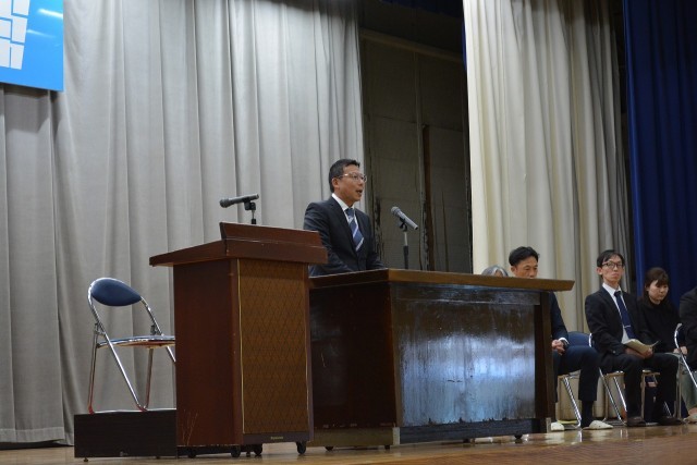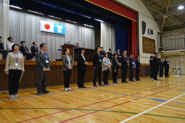 令和7年度末をもって異動された先生方とお別れをする「離任式」が行われました。最初に校長から先生方の紹介があり、その後お一人お一人から心のこもったあいさつをいただきました。生徒たちは真剣な顔で受け止めていました。